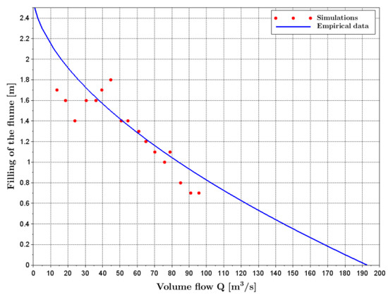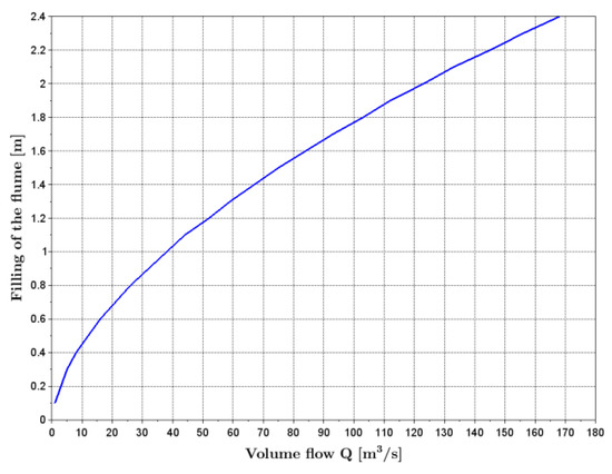 According to the above model, a curve determining the flume’s filling as a function of flow was obtained, which is shown in Figure 3. It allowed determining the head-flow relation, assuming a constant upper reservoir level. The assumption of a constant upper reservoir level results from the barrage construction and the maintenance of the required shipping parameters on the waterway. The adopted water level in the upper reservoir is directly related to the issued water permit requirements for the analyzed barrage. The assumed water level in the upper reservoir results from the necessity to maintain the shipping conditions.