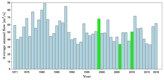 Summary of the average annual flow in 1971–2018 (the years analyzed in detail are marked in green).