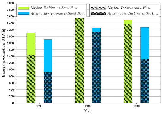 Summary of annual electricity production. Green refers to the Kaplan turbine and blue to Archimedes turbine, taking into account the minimum head. Both types of turbines are marked with hatching for calculations, excluding the minimum head impact.