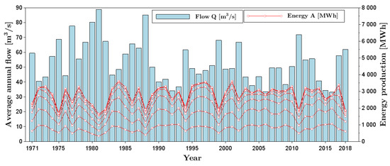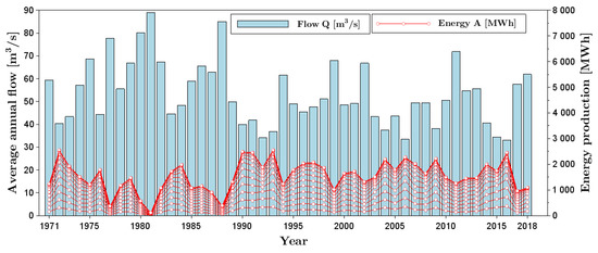Figure 12 shows the average multiyear energy production for three selected years, depending on the number of installed turbines. An interesting and distinctive aspect is the lack of an increase in energy production if the number of Archimedes turbines exceeds twelve, which corresponds to the installed rated flow value of 54 m3/s. Taking into account the environmental flow of 5 m3/s, it gives a flow of 59 m3/s. This value is close to the flow at the minimum head.