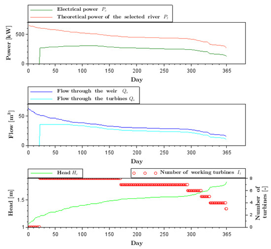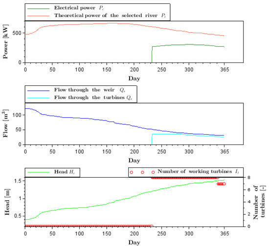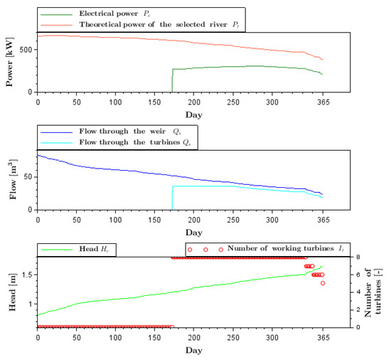 To explain the differences as mentioned above, Figure 9, Figure 10 and Figure 11 are presented. They consist of several sub-charts. The first sub-chart presents the power plant’s actual power and the theoretical power of the watercourse during the year. It results from, among other things, the ordered flow through the weir, i.e., the entire stream of water in the watercourse, which is shown below. Moreover, the flow through the power plant is presented, which depends on the number of running hydro units, never reaching the full water use in the watercourse. This is due to the necessity to ensure an environmental flow, the value of which is specified in the water permit and is related to the minimum environmental requirements [49]. For the considered barrage, the environmental flow is 5 m3/s, maintained through, among other things, a fish pass and leaks in the weir. The last sub-chart presents the number of running turbines depending on the current head in the barrage. The discussed sub-graphs form a coherent whole allowing for analyzing the barrage’s power plant operation and, in a broader sense, a comparison of this work, in years, with different average flows.
