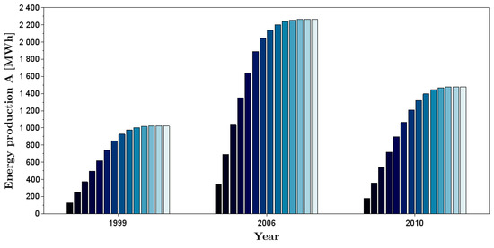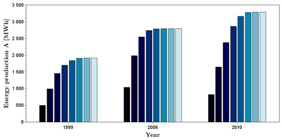 The data for the three selected years presented in Figure 6 should be compared in a broader view. Figure 7 and Figure 8 show that changes in the annual energy production are observed, which are not proportional to the average annual flow increases. The annual average flow in 2010 was 50.5% higher than in 2006, while the energy yield was lower for Kaplan and Archimedes turbines by 6.8% and 38.2%, respectively. For 1999, the observed falls in production are significant. They are equal to 38.9% (Kaplan) and 29.9% (Archimedes) in comparison to 2010, with a significant 34.8% increase in the average flow.