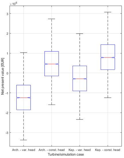 Considering the NPV criterion, large variances are noticed in the profitability of investments. As shown in Figure 14, assuming that the minimum head is not taken into account, both the Archimedes and Kaplan turbines are economically justified in the vast majority of cases. For the Kaplan turbine technology, the phenomenon of a negative NPV criterion (unprofitable investment) is sporadic. Considering the critical factor in the analysis, which is the hydro unit’s minimum head parameter, it leads to entirely different results. Investments in a hydropower plant based on the Archimedes turbine technology are unprofitable in virtually every input variable configuration in the models. However, in the case of hydropower plants with Kaplan technology, there are some cases where the investment may be profitable. Nevertheless, the NPV indicator clearly shows that an investment in a hydroelectric power plant of such a capacity, for the assumed input parameters, is unprofitable.