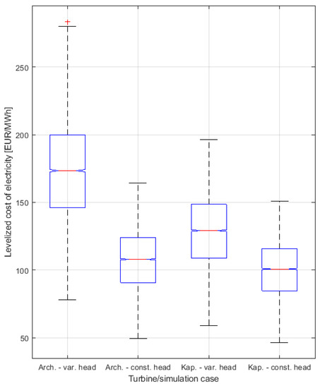 Considering the occurring parameter of the hydro unit’s minimum head and its impact on the electricity yield by a given hydro power plant or a turbine enables a more accurate estimation of the levelized cost of electricity (LCOE). It is a commonly accepted criterion for comparing different sources of electricity. As shown by the results presented in Figure 15, the unit cost of electricity from hydropower plants working with Archimedes and Kaplan turbines (for calculations that did not consider the minimum head) is, consecutively, 175 Euro/MWh (Archimedes), and approx. 130 Euro/MWh (Kaplan). In Poland, the current electricity price for household consumers is 137 Euro/MWh (including taxes) [50].
