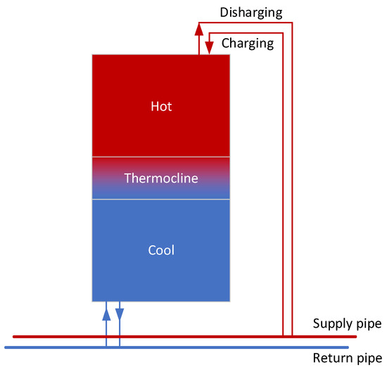 A stratified thermal storage water tank is typical to heat storage [9], which is widely used in Europe practically. In this type of water tank, hot water is withdrawn (or injected) from the top of the tank, while the cold water would be injected (or withdrawn) into the bottom of the tank to keep the volume constant. Physically, the hotter water is with lower density and thus naturally stays in the upper part of the tank, and the colder water would stay in the lower part of the tank. Thus, if well controlled, the water tank would be stratified and able to store thermal energy. However, due to the heat conduction on the water interface with different temperatures, there would be a third layer, i.e., the thermocline layer, between the hot-water and the cold-water layers. In the thermocline layer, the temperature changes quickly. As time goes, this layer would gradually become thicker, degrading the tank’s valid heat capacity. Figure 2 shows the structure of this type of water tank and its connection with DHN.