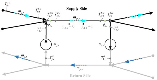 Mixing temperature constraints could be simplified as the above constraints Equations (61)–(69). Equations (61)–(63) ensure that the maximal mass flow rates are not always smaller than all inflows. Equations (64)–(66) guarantee that the selected flow is the largest inflow. Once the dominating flow is selected, if it is a pipe flow, Equations (67) and (68) ensure the mixed temperature equals its outlet temperature. If it is a nodal flow, Equations (69) ensures the nodal supply temperature coincides with the mixing nodal temperature. All identical principles are also applied to the return network. For the sake of simplicity, mixing temperature constraints in the return network are not presented here.