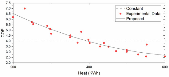 However, some experimental results indicate that the COP is not constant, thus requiring more precise models for heat pumps. In fact, the COP would decrease as heat production increases [5]. This relationship could be modeled by the quadratic function, as shown in Equation (5).