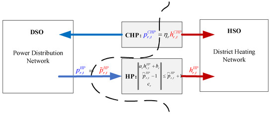 - Cao, Y.; Wei, W.; Wu, L.; Mei, S.; Shahidehpour, M.; Li, Z. Decentralized Operation of Interdependent Power Distribution Network and District Heating Network: A Market-Driven Approach. IEEE Trans. Smart Grid 2019, 10, 5374–5385. [Google Scholar] [CrossRef]