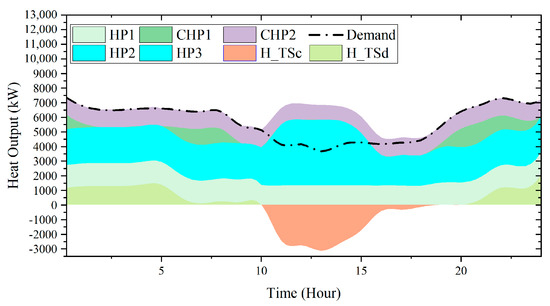 As mentioned above, hot and cool water could be stored simultaneously in a stratified thermal storage water tank. However, the heat loss between two layers of water could not be neglected. Equations (11)–(14) are constraints for heat storage operation, where denotes the loss in the thermocline layer, while denotes the efficiency of charging and discharging in the water tank. To incorporate the storage model into the network model, indicating the state of charging and discharging is introduced.