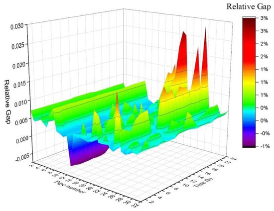 Note that the temperature loss could be calculated from Equations (32) and (33). The nonlinear exponential function in Equations (32) and (33) can be linearized as Equations (55) and (56). Finally, the heat loss could be simplified as a constant if the inlet pipe temperature is substituted by a reference temperature. Usually, the inlet temperature would vary in a small range. If this reference temperature is carefully chosen, the heat loss can be simplified without losing much accuracy. Later in Section 4, we would go into more detail to verify the conclusion made here by numerical studies.