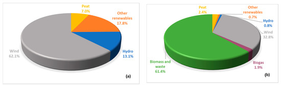 The distribution of electricity generation from different renewable energy sources in Estonia: (a) 2008 and (b) 2018 [30].