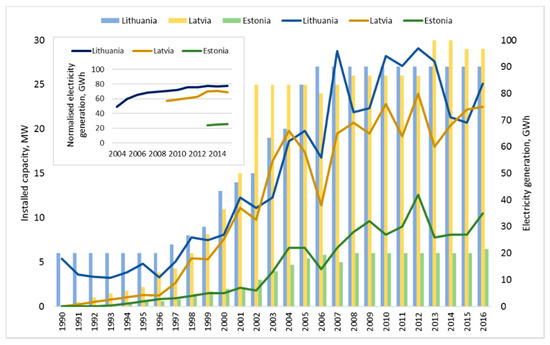 The installed capacity and electricity generation of small hydropower plants in the Baltic States for the period from 1990 to 2016.