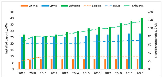 The growth in electricity generation from renewable energy sources aided all the Baltic States to reach their targets ahead of time regarding the share of energy from renewable sources in the final energy consumption set for 2020. Lithuania and Estonia reached their target in 2015 and Latvia in 2018 [2]. The next step will be new targets set for 2030, and the national renewable energy action plans (NREAPs) will be followed by national energy and climate plans (NECPs). The NECPs goals for Estonia are a 42% share of renewable energy in the final consumption of energy and a 40% share of renewable electricity. For Latvia, these goals are 50% and 60% and, for Lithuania, 45% and 45%, respectively [35].