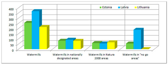 The historic value of old watermill sites is acknowledged in all three Baltic States, as 36 sites in Lithuania, 32 sites in Estonia, and 122 sites in Latvia (which were considered in this study) are listed as under national heritage protection. The importance of many of these sites is further enhanced by the fact that in these watermills, the original equipment and hydroturbines have often survived to this day. The restoration of these sites can provide a great social boost for local rural communities as watermills can become objects of attraction for tourism and recreational purposes. Already, examples exist in Europe where micro-hydro schemes are owned by local communities [53]. However, even if all possible environmental measures could be enacted at old watermill sites, the retrofitting is prohibited by the environmental regulations in the Baltic States if the watermill site falls into an environmentally sensitive area.