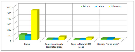 In Estonia and Latvia, there are 125 and 214 rivers and their stretches that are exempt from further dam construction. In Estonia, the list of “no go areas” is intended for the protection of salmonids, their spawning areas, and habitats [19]. In Latvia, these designations aim to protect all fish resources [20].