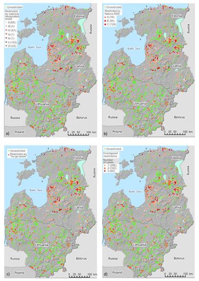 A visualisation of the distribution of historic watermills and nonpowered dam sites is presented in Figure 12. This also includes mapping on how many of these sites falls within the boundaries of protected areas in the Baltic States, according to the International Union for Conservation of Nature (Figure 12a) [47], as well as within each category of Natura 2000 sites (Figure 12b) [27] and within rivers or river stretches designated as “no go areas” (Figure 12c). Additionally, historic watermill and nonpowered dam sites that are in overlapping environmentally sensitive areas are categorised as follows: historic sites that fall under one restriction are marked with 1; the sites that fall under two restrictions are marked with 2; and if sites fall under all restrictions considered in this study, they are marked with 3 (Figure 12d). Therefore, in Figure 12d, we present the final view of the distribution of historic watermills and currently nonpowered dam sites that are and are not under restriction for hydropower development in the Baltic States.