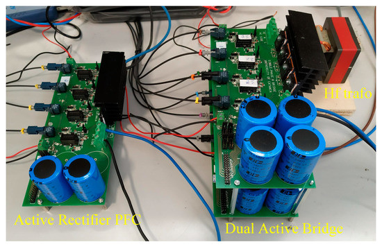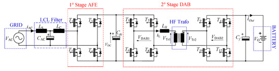 For the application of a single-phase BBC, the proposed converter consists of two stages exploiting three H-bridges with modularity in the power board arrangement. Power devices with the same voltage breakdown should be used since the input and output voltage levels are similar. In this case, the three H-bridges can be identical, thus simplifying the converter design for the proposed converter that exploits identical SiC devices. As shown in Figure 2, the first stage is an AFE connected to the grid through an LCL filter which is useful to ensure both the power quality and the control of the power exchanged with the grid, while the second stage consists of a DAB converter.