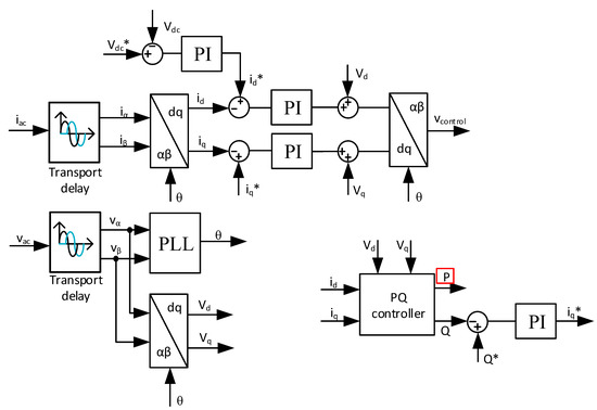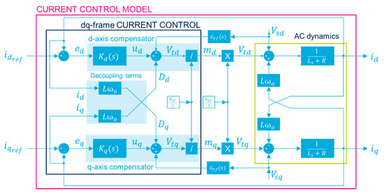 Simple and robust PI current regulators can be used to track references since the dq-axis signals in steady-state are constants (Equation (8)). The result is the controlled model given by Equations (9) and (10), as shown in Figure 4.