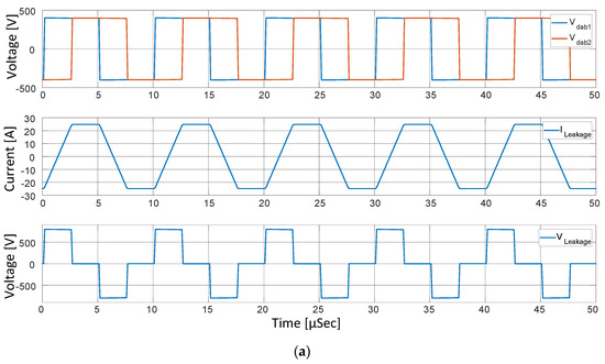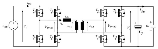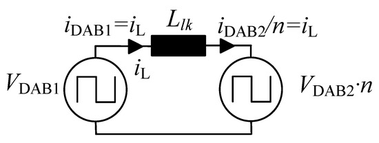 where −180° < < 180°, V1 and V2 are the input and output voltages of the DAB (Figure 8); n is the transformer turn ratio; fs is the switching frequency and Llk is the leakage inductance when considering a lossless DAB model.