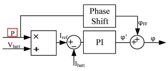 In V2G mode, the battery is discharged and the bridge acts in inverter mode (DC/AC). The control strategy consists of maintaining constant the voltage value on the bus-dc and managing the PF to compensate the amount of reactive power required by the grid. The control loop block diagram for the DAB is shown in Figure 10.