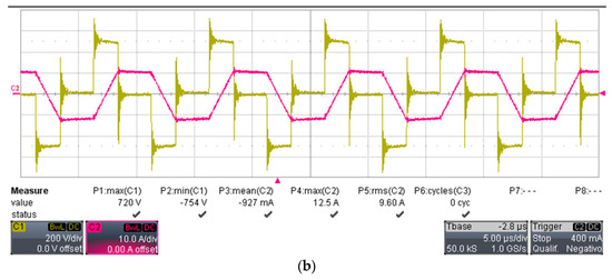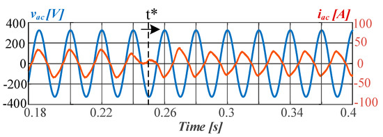 The power required from the AFE acts on the phase-shift; by varying this reference, it is possible to reverse the power flow. Some simulated and measured waveforms obtained during the G2V mode are shown below. In Figure 13, the simulated first stage waveforms that are the grid voltage vac and current iac with unitary PF, and the ripple of the DC voltage are shown. The total harmonic distortion for the AC current was close to 7%, which is in accordance with the value measured (less than 10%) using the prototype.