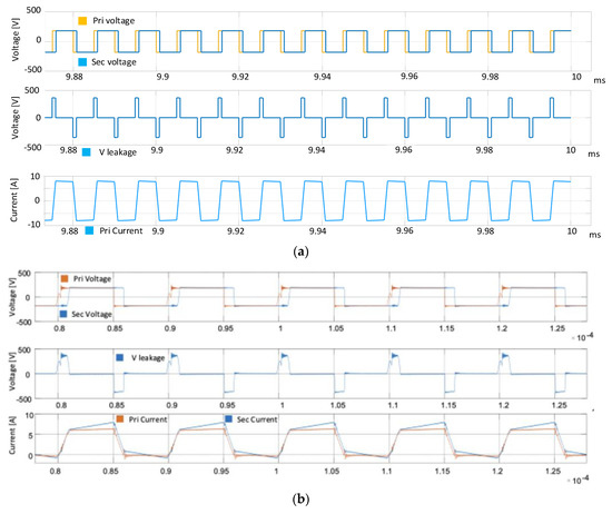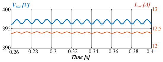 The voltage and current on the primary side of the transformer are shown in Figure 14. The simulated waveforms were in good agreement with the measured ones. The main difference was the lack of oscillations in the simulated voltage. These oscillations were due to the coupling between the parasitic capacitance of the devices and the parasitic inductances in the power loop that were neglected in the model. The current waveform depends on the phase-shift between the two transformer-ends voltages. The secondary side quantities were pretty similar, as a turn ratio n equal to one was chosen. The leakage inductance, Llk, affected the power delivered in the DAB converter. Therefore, the voltage vL waveform was strictly related to the power direction. The DC output waveforms are shown in Figure 15, where the ripple of the voltage Vo and current Io are highlighted.
