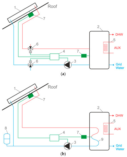 Figure 1. Solar thermal system: (a) with forced circulation of the water in an open-loop system with a solar controller (1), storage tank (2), hydraulic pump (3), solar controller (4), auxiliary water heater (5), valve (6), temperature sensors (7); (b) with forced circulation of the water with antifreeze, expansion vessel (8), and heat exchanger (9) to separate the domestic hot water circuit from the solar.