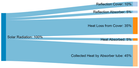 where σ represents the Stefan-Boltzmann constant (being σ equal to 5.6710−8 W/m2.K4). The most important heat losses occur on the top surface of the solar collector through convection and radiation. It is generally assumed that about 80% of the solar radiation is adsorbed by the plate, but only 45% of the heat is collected by the collector tubes [44]. A simplified Sankey diagram of the heat flow at a standard flat-plate solar collector is shown in Figure 4. This output corresponds to average values reported in the literature, assuming that a fraction of the radiation is reflected back to the sky, another fraction is absorbed by the glazed cover, and the remaining is transmitted through the glass, reaching the absorber plate as short wave radiation [46,47,48].