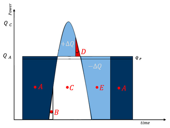 When solar energy is enough to increase the thermal fluid temperature, the necessary heat for the building appliances is supplied by the solar collector panel (C region) and the surplus is stored in the storage tank, which is represented by the positive heat variation (+ΔQ). The solar thermal system has a limited capacity to store the heat. From that point, all excess heat is dissipated (D region). Afterwards, when the heat captured by the solar panel is not enough to supply the useful energy requirements, the heat accumulated in the tank is then used to compensate for this difference (E region), which is represented by the negative heat variation (−ΔQ). By the end of the day, the collector stops capturing solar radiation (A region).