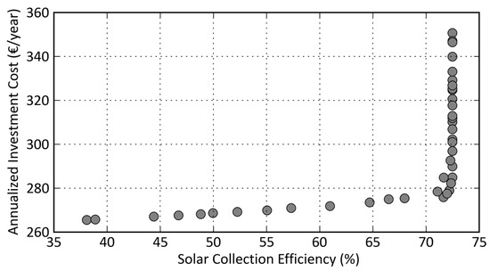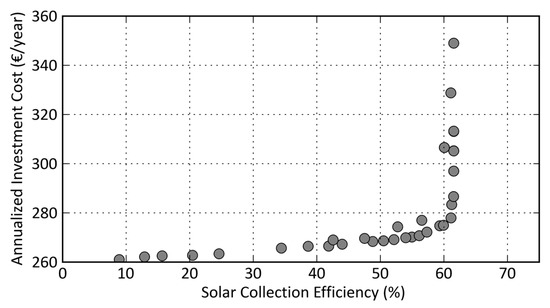 The two most important physical variables that affect the solar collector (Csolar) cost are the collector area and the collection efficiency. Thus, the cost equation is given by Equation (8):
