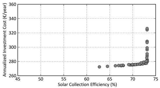 Figure 8. Pareto optimal frontier in the objectives’ solution space for an incident radiation of 900 W/m2.