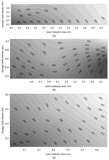 Figure 10. Annualized investment cost as a function of storage tank volume and solar collector area: (a) assuming an incident radiation of 900 W/m2; (b) assuming an incident radiation of 950 W/m2; and (c) assuming an incident radiation of 1000 W/m2.