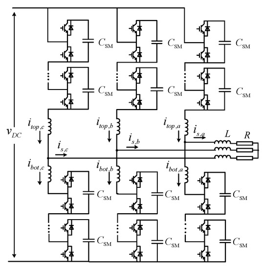 The modular multilevel converter (MMC) has been widely studied because it presents great advantages such as a transformer-less and modular structure, common DC bus, and good harmonic characteristics [1,2,3]. These advantages make MMC the most attractive topology for various medium- and high-voltage, high-power applications, such as high-voltage direct-current (HVDC) transmission systems [4,5], static synchronous compensators (STATCOM) [6,7], high-voltage isolated DC/DC [8], and medium-voltage motor drive [9,10,11,12].