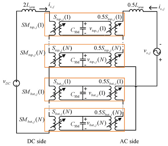 where , are voltages across N top SMs and bottom SMs in phase j (), respectively. , are the output voltage and current of phase j , respectively. is arm inductance, and is the DC-link voltage. The circulating current circulates through both the top and bottom arms of phase j, which is expressed as