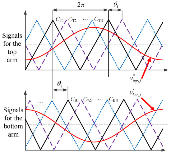 Each SM corresponding to a specific triangular carrier with different displacement angle. The general carrier function of the top and bottom SMs can be calculated as: