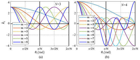 Harmonic-cancellation characteristics of , and are affected by and . Item can eliminate the harmonics of the whole group with proper , and the relationship between and is shown in Figure 4. If equals to , all the even multiples carrier-frequency harmonic groups except those at -multiples and its integral multiple are eliminated. For example, the harmonics of group and are eliminated when . The harmonics of group , and are eliminated when . If equals to , all multiples carrier-frequency harmonic groups except those at N-multiples and its integral multiples are eliminated. For example, the harmonics of group , , and are eliminated when . The harmonics of group , , , , and are eliminated when .