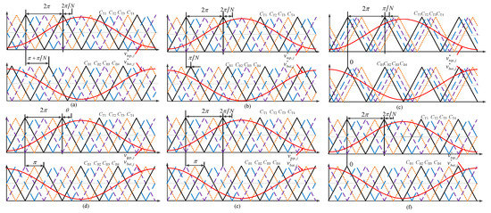 The MMC allows for the flexible selection of inserted submodules (SMs), so there are various modulation methods that directly affect the harmonic characteristics of output voltage and circulating current. The staircase wave-modulation methods in [13] are preferable in applications that require an extremely high number of SMs, such as HVDC applications. Some optimization schemes for reducing power losses are mentioned in [14,15]. The selective harmonic eliminating modulation technology [16], space vector pulse-width modulation (SVPWM) [17,18], and phase-shifted carrier sinusoidal pulse-width modulation (PSC-SPWM) technology [19,20,21,22,23] are also considered as modulation methods for MMC applications that need fewer submodules. Among these methods, PSC-SPWM technology is more used for fewer SMs. Each power unit has the same switching frequency with PSC-SPWM, which is a benefit for heat-dissipation structure design. When PSC-SPWM is applied, the output voltage of MMC, as shown in Figure 1, has or levels with different displacement-angle assignments between the carriers of each SM [21]. The displacement angle affects the harmonic characteristics of output voltage and circulating current. An available implementation scheme of PSC-SPWM technology for MMC was presented in [22]. The displacement angle is set to when N is even, and 0 when N is odd for maximal harmonic cancellation of output voltage. On the other hand, to achieve the greatest harmonic cancellation of circulating current, the displacement angle should be when N is odd, and 0 when N is even. However, the angle irregularly changes according to the parity of SM number. Furthermore, how the displacement angle between the adjacent SMs in the same arm influences the performance of harmonics and the voltage-balancing issue of capacitors is not considered. Energy distribution is only relatively balanced between submodules when the right displacement angle is selected. Four available PSC-SPWM schemes were presented with performance comparison about output voltage and circulating current harmonic characteristics in our previous paper [23], whereas the selection of displacement angle does not give theoretical derivation.