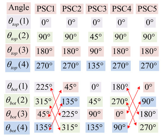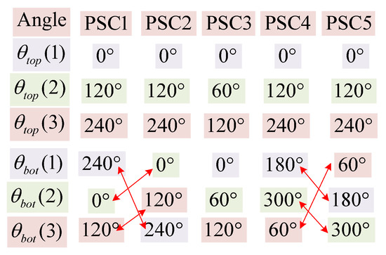 Carrier angles of each SM for five PSC-SPWM schemes when (odd number SMs example) and (even number SMs example) are listed in Figure 6 and Figure 7. PSC1, PSC2, and PSC3 are the minimal voltage harmonic schemes. PSC4 (when ) and PSC5 are the minimal circulating current harmonic schemes. Considering that the status of each SM in the same arm is identical, PSC1 and PSC2, PSC4, and PSC5 are equivalent except that SMs in the bottom arm corresponding to the top arms are different. SMs with the same status (carrier angle) are filled with the same color and connected by red arrows. Obviously, the proposed PSC1 and PSC4 could automatically distribute the carrier angle.