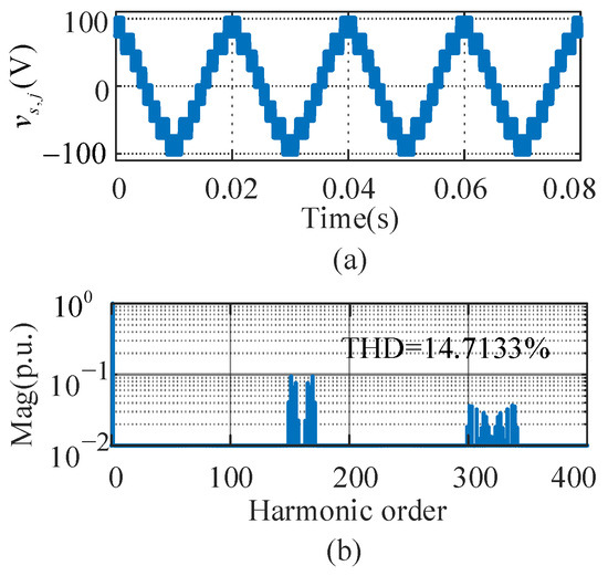 Theoretical output voltage of PSC4. (a) Waveform of equivalent output-phase voltage; (b) FFT analysis.