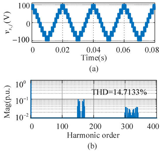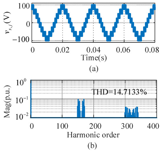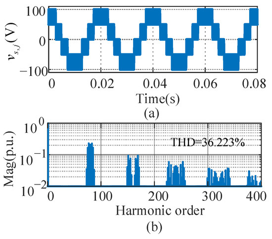Figure 9, Figure 10, Figure 11, Figure 12 and Figure 13 shows the simulation results of output-phase voltage with five PSC-SPWM strategies. The equivalent output-phase voltage reached levels with PSC1, PSC2, and PSC3, which had maximal output-voltage harmonic-cancellation ability, and voltage total harmonic distortion (THD) was 14.7% with the main odd side-band harmonics around -multiples carrier frequency and its integral multiple harmonic groups. The simulation results of PSC4, when , and PSC5 are shown in Figure 12 and Figure 13, respectively. Both of these PSC-SPWM schemes had the same output characteristics. Equivalent output voltage reached levels, and voltage THD was much larger than that of PSC1, PSC2, and PSC3, with 36.223%. The main harmonic components were around N times the carrier frequency and its integral multiples.