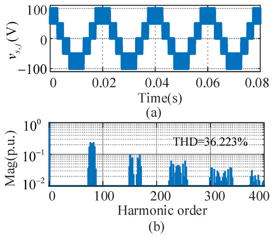 According to (12) and (14), if one of , and is equal to 0, the corresponding output-voltage harmonic components can be completely eliminated. The corresponding circulating current harmonic components can be completely eliminated if one of , and is equal to 0 in the same way. Specifically, if index m is odd/even, and index n is odd/even, equals to 0 in the expression of both Equations (11) and (13). As a result, odd side-band harmonics are eliminated in the output waveform and voltage of arm inductors around the odd carrier frequency multiples and the even side-band harmonics are eliminated in the output waveform and voltage of arm inductors around the even carrier-frequency multiples.