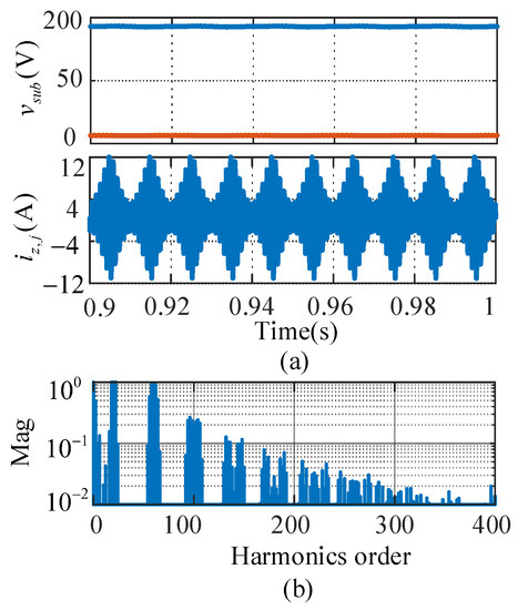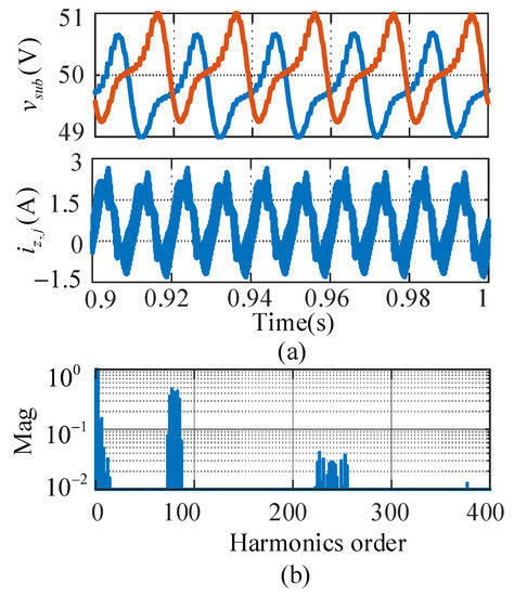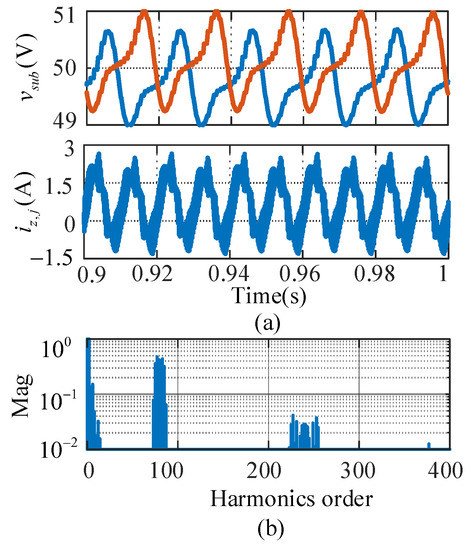 where is a fundamental period. SM capacitor voltage is affected by switching function, circulating current and the load current. Natural balancing of the 2-Cell modular multilevel converter with traditional PSC-SPWM schemes was discussed in [24], which is closely related to harmonic distribution of output current and circulating current. If the switching function and circulating current contain the same harmonic components, or the switching function and phase current contain the same harmonic components in the orthogonal trigonometric system, the right side of (21) could contain a non-negligible DC component. Voltage variation in a fundamental cycle is not equal to zero, and the capacitor voltage of each SM deviates from the rated value.