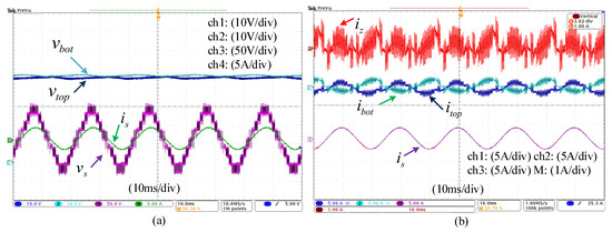 Figure 20 shows the experiment results with PSC2, where displacement angles were selected as and . PSC2 achieved the same characteristics as those of PSC1. The equivalence of PSC1 and PSC2 was verified as analyzed before, and only SMs corresponding to the top and bottom arms were different; the proposed PSC1 unified two different cases of odd and even SM situations for maximal harmonic elimination of output voltage.