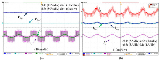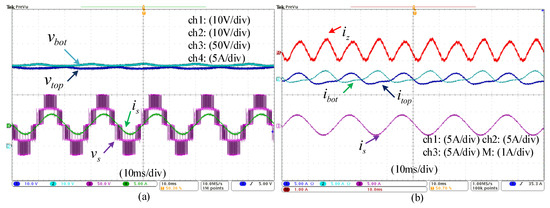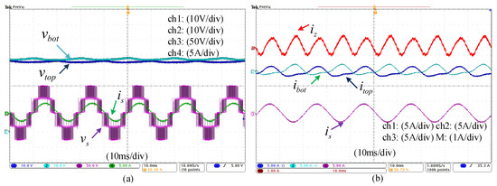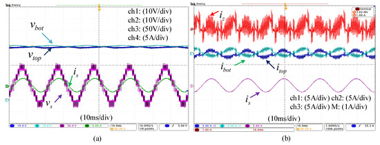 Figure 23 shows the experiment results with PSC5, where displacement angles were selected as and . PSC5 achieved the same characteristics as those of PSC4. PSC4 and PSC5 were equivalent as analyzed before, and only SMs corresponding to the top and bottom arms were different. The proposed PSC4 when could unify two different cases of odd and even SM situations for the maximal harmonic elimination of the circulating current.
