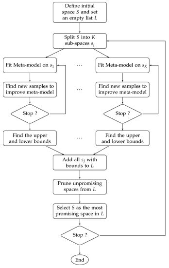 We propose an algorithm that builds many metamodels, each on a specified region of the design space; each one of them is relatively easy to fit and is used to estimate the upper and lower bounds. Then, iteratively, it excludes the regions that are not promising. By adopting this algorithm, the drawbacks mentioned earlier are tackled, namely, the numerical ones related to the correlation matrix. The flowchart of the algorithm is shown in Figure 1.