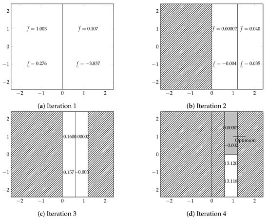 After only four iterations, the algorithm has located the subspace where the optimum lies. The grey region is the only space that was left in the list L.