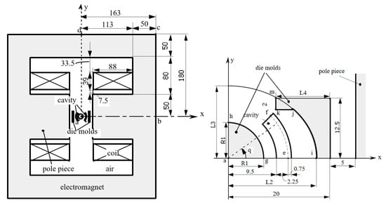 In this test case, the device is used to orient the magnetic powder and produce anisotropic permanent magnets []. The magnetic powder is inserted into the cavity. The orientation and strength of the magnetic field should be controlled in order to obtain the required magnetization. A coil creates the magnetic field. The current density is fixed to A/mm2. The die press and electromagnet are made of steel with a nonlinear permeability. The geometry of the whole device is shown in Figure 3.