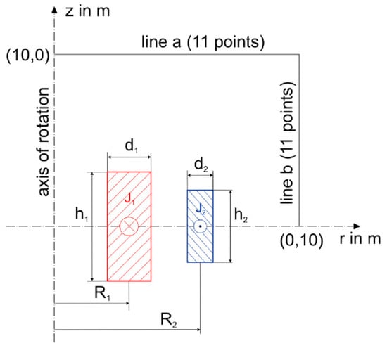 The Superconducting Magnetic Energy Storage (SMES) device in Figure 4 consists of two concentric superconducting coils fed by currents that flow in opposite directions []. The inner coil is used for storing magnetic energy E, while the outer one has the role of diminishing the magnetic stray field computed on line a and line b.