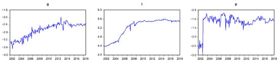 This research paper utilizes the Time-Varying Coefficient Cointegration approach (TVCC hereafter) suggested by Park and Hahn [6] as a main tool. For robustness check the Structural Time Series Modeling-STSM [42] and Multiplicative Indicator Saturation-MIS [43,44,45] approaches have been employed. These approaches nest the fixed/constant coefficient case as a special case. Furthermore, these approaches enable us to test the coefficients for time-variation. The TVCC approach uses Fourier Flexible Forms (FFF) to “catch” the behavior of the varying coefficient, STSM does it using random walk parameters/coefficients, return to normality model and spline function approaches [42], while the MIS approach utilizes multiplicative step dummies methodology. Since the TVCC and STSM techniques are used in a number of papers and described in detail we will not explain them here. Harvey [6], Koopman et al. [46], Commandeur and Koopman [47], and Mikayilov et al. [48] for STSM, Park and Hahn [6], Chang et al. [49], Mikayilov et al. [39] for TVCC can be referred to for details. While the MIS approach is used only in a few studies. Hence it is briefly described below. For further details on the MIS Ericsson [43], Castle et al. [44], and Castle and Hendry [45] are valuable sources to be referred.