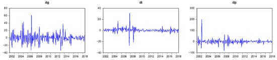 Plots of the differenced variables. notes: dg, di and dp are differenced gasoline demand and income, both in per capita terms, and real gasoline price, respectively. d is difference operator.